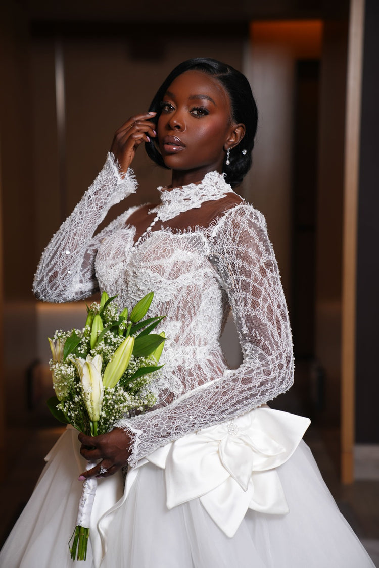Regal and breathtaking, this gown is a symphony of contrasts delicate lace meets bold architectural volume. The intricately embellished bodice, adorned with cascading floral lace and sheer illusion paneling, hugs the silhouette with refined grace, while the high neckline adds a touch of timeless sophistication. Long sleeves in translucent lace offer an ethereal quality, balancing modesty with allure.